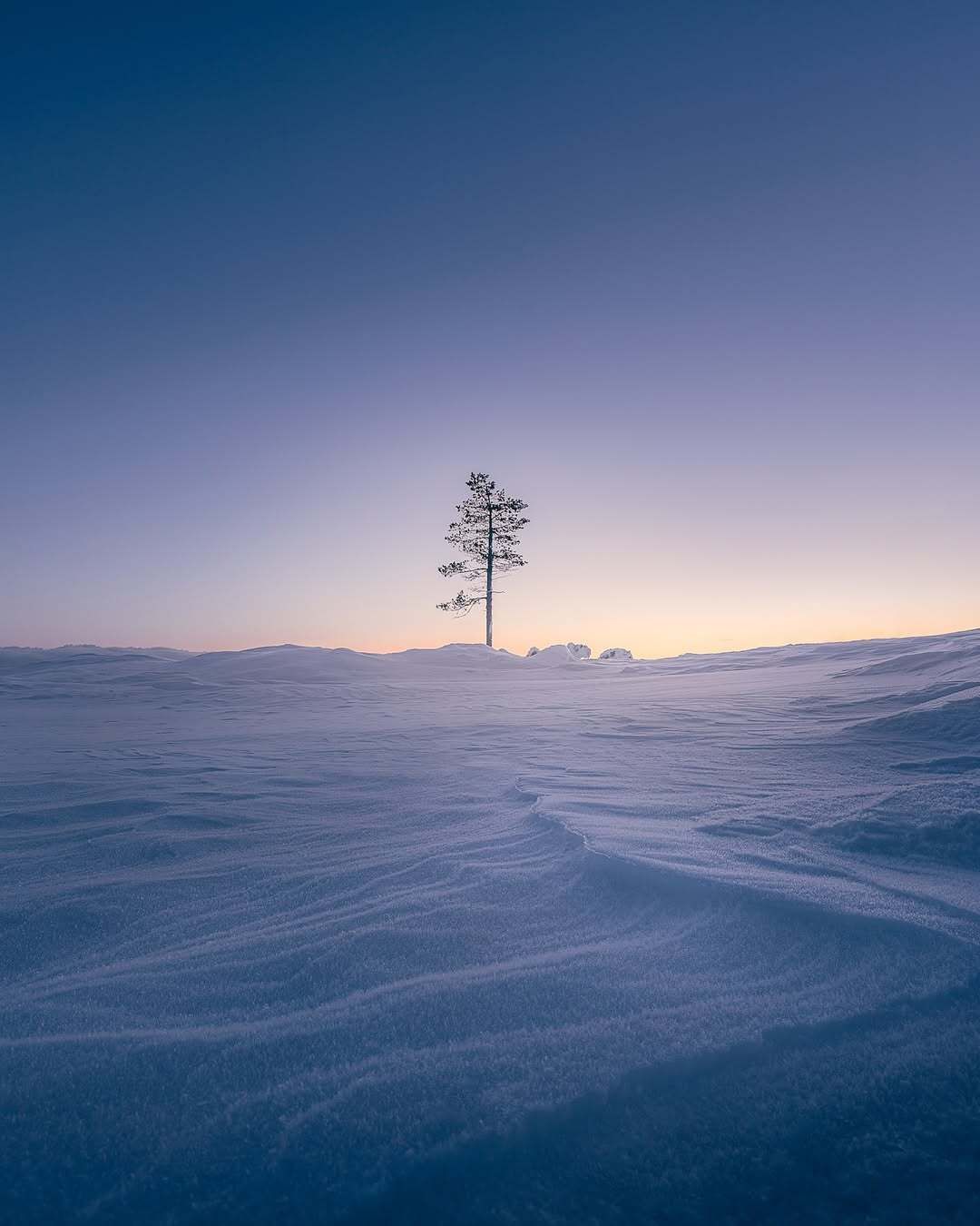 A lone pine tree standing in the middle of a vast frozen snowfield at dawn, smooth wind-sculpted snow in the foreground with subtle texture lines, pastel gradient sky shifting from deep blue to soft lavender and warm sunrise glow on the horizon, minimalist composition, ultra wide angle, low perspective, cinematic lighting, peaceful winter atmosphere, high detail, sharp focus, soft natural light, photorealistic, 8k, fine art landscape photography.