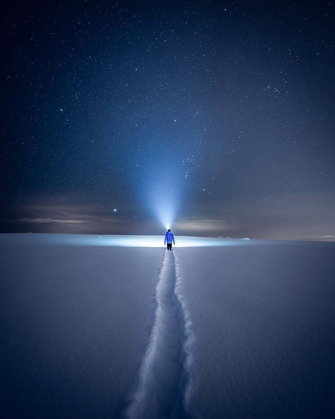 A dramatic night landscape beneath a vivid aurora borealis, with massive flowing curtains of green and purple northern lights swirling across a star-filled sky. The aurora forms a dynamic circular motion overhead, glowing intensely against the darkness. Below, a vast open tundra stretches into the distance under low clouds. A lone person stands on the right side of the frame, shining a bright beam of light upward toward the sky, emphasizing scale and isolation. Cinematic realism, long-exposure photography, ultra-wide angle, high contrast, natural colors, photorealistic, 8k detail.